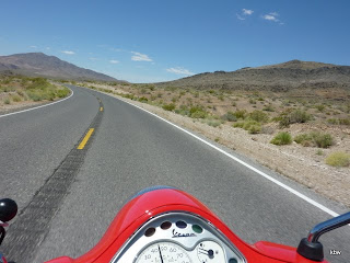 Said our goodbyes again and headed on down the road. After Puramph there was no development. It was a great ride. Around 11am we entered the Death Valley National Park. There had been no "Welcome to California" or "Goodbye Nevada" signs.We descended from 3000 feet to 243 feet below sea level. Scoot was loving this being back down low and we were roaring along.
